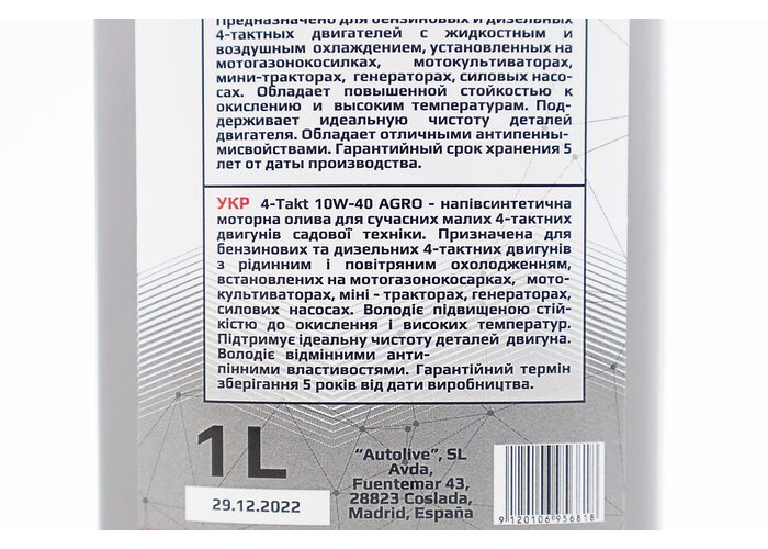 Масло 4T 10W-40 - минеральное универсальное "AGRO" 1L производства AUTOLIVE