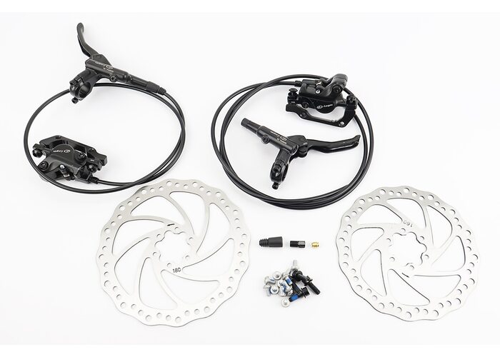 Гальмо Disk-brake гідравлічне переднє (F180/R160мм)+заднє (F180/R160мм) у зборі, диски 160/180мм, кріпл. 6 болтів, чорні виробництва LOGAN