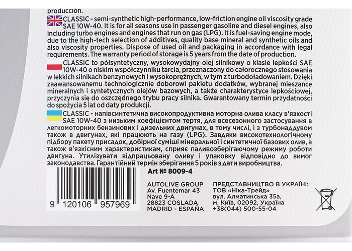 Олива 4T 10W-40 - напівсинтетична універсальна "Classiс", 4L виробництва AUTOLIVE
