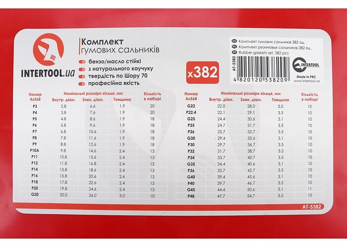 Набір манжетів 382шт різних розмірів у пластиковому боксі AT-5382 виробництва INTERTOOL